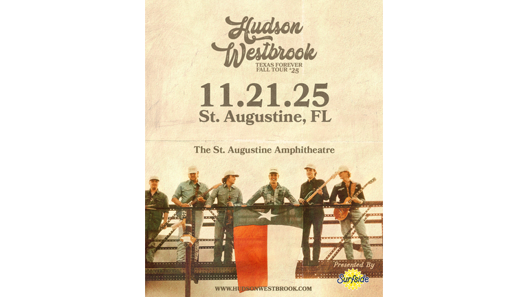 The St. Augustine Amphitheatre is pleased to welcome Hudson Westbrook on Friday, November 21, 2025 for his Texas Forever Tour! Tickets go on sale next Wednesday, June 25 at 11am online at www.TheAmp.com or on www.AXS.com and in-person at the venue Box Office.