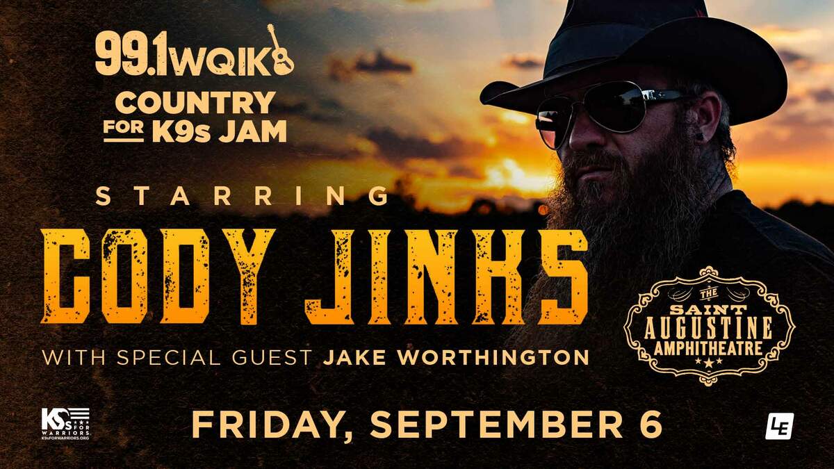 Get ready for a night of unforgettable country music when 99.1 WQIK presents its Country for K9s Jam, featuring RIAA Platinum recording artist Cody Jinks on Friday, September 6, at the St. Augustine Amphitheater.